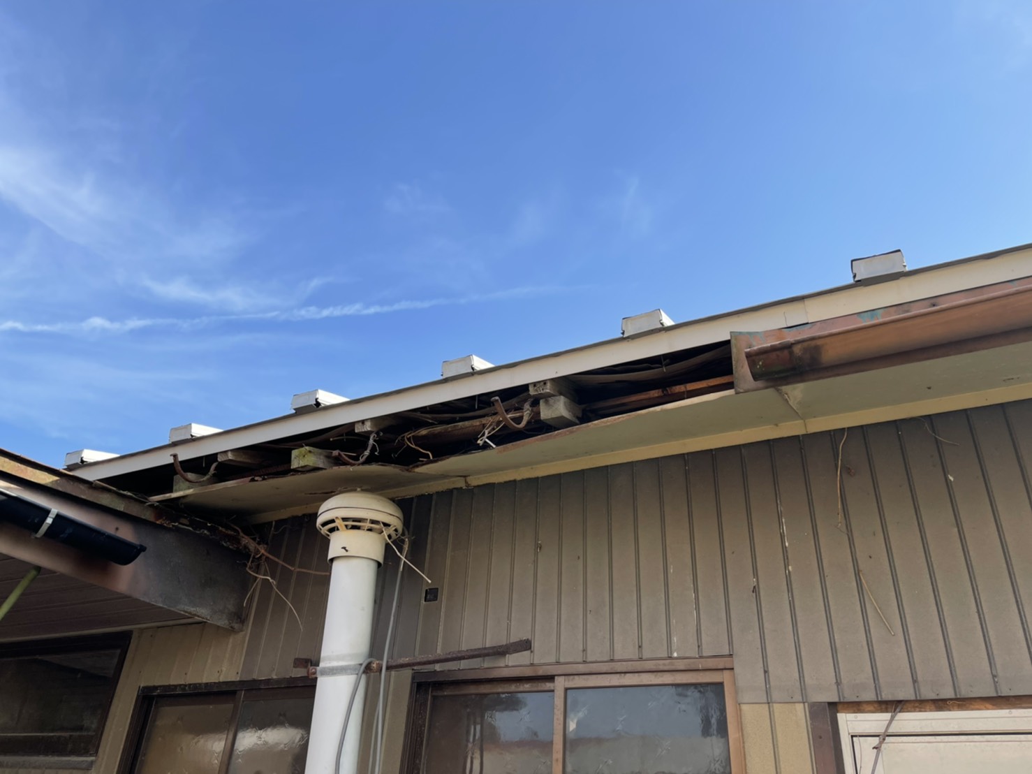 お写真のように、あまどいが壊れると、軒下などを中心に、お家自体がダメージを受けてしまいます。あまどいの大切さがわかりますね。こうなってしまう前に、お早目に修理をしましょう。
